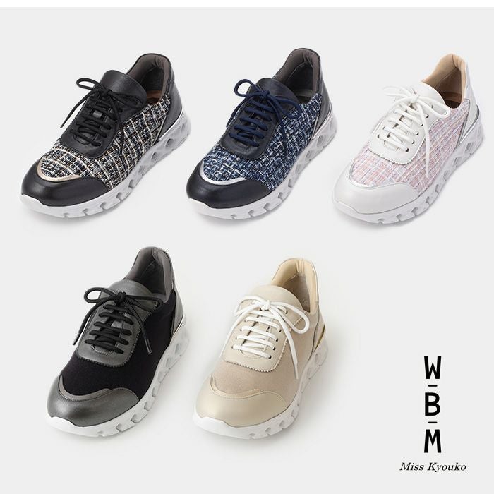 Miss Kyouko25周年記念で誕生したブランド「W-B-M(ウェル ビーイング ミスキョウコ)」。自分の時間を楽しみ、活動的に幸せな生活を送るライフスタイルを提案。「しっかり歩く」「体を動かす」を叶える4E超軽量スニーカーです。