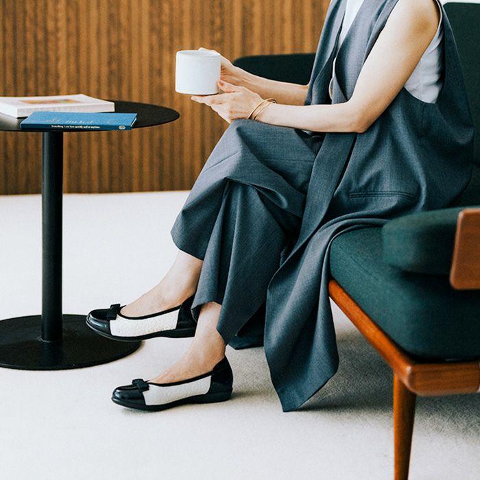 エナメルとスムースレザーのコンビで大人可愛い撥水シューズ。